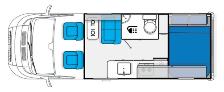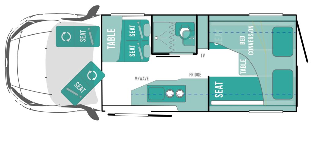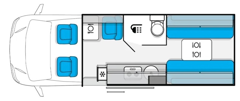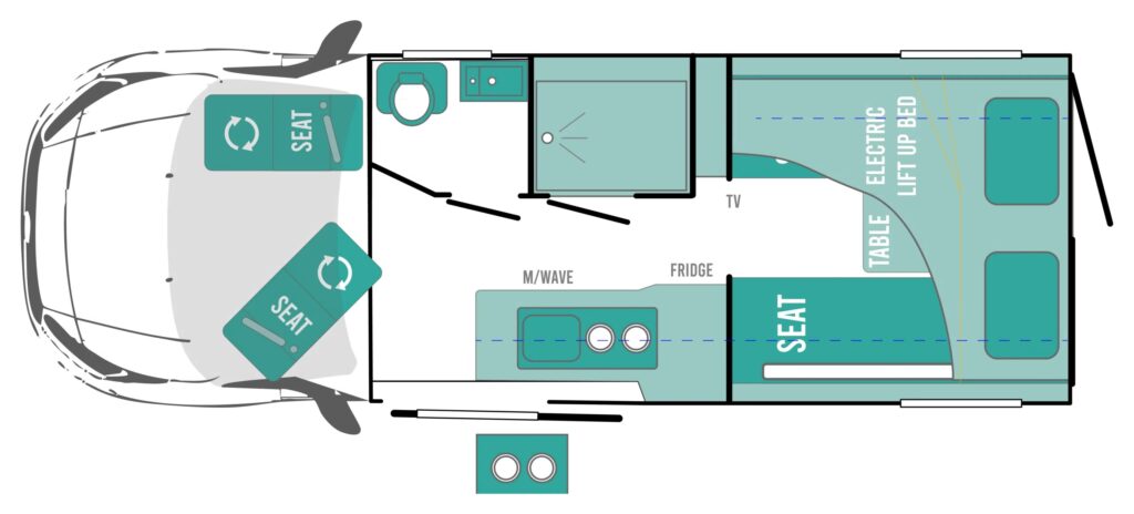 The A2M layout is built on the medium wheel base and is a bit of a departure from their other layouts. It looks like the bathroom no longer includes the ‘hideaway toilet’, and the kitchen has the portable induction stove rather than the diesel cooker; but the beds are easily converted to whatever layout suits you best.