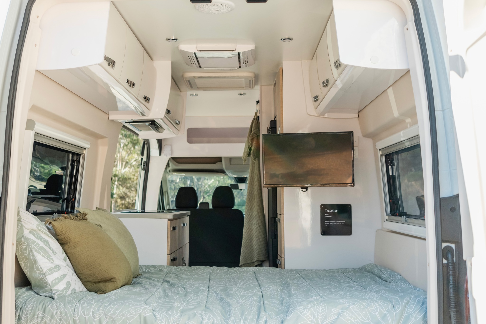 Interior of the Horizon Boronia camper van showing the kitchen area and bed in the background.