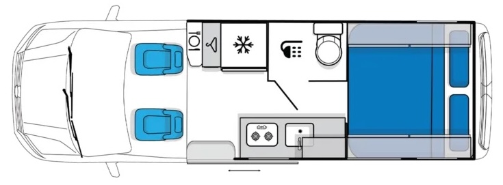 Floor plan of the Horizon Banksia campervan with a fixed bed across the back of the van.