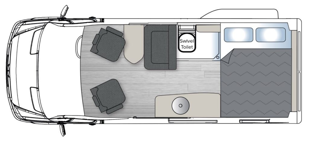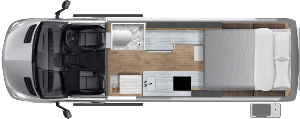Floor plan of the Horizon Wattle camper van with a double bed in the rear corner of the van.